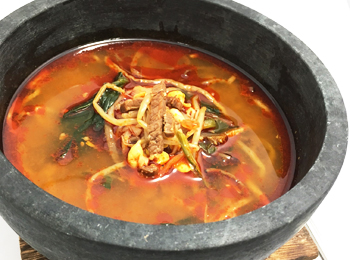 - 牛肉を煮た湯に3と160gの水を加え、少し煮込み、出汁顆粒で味を調える。